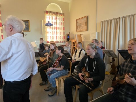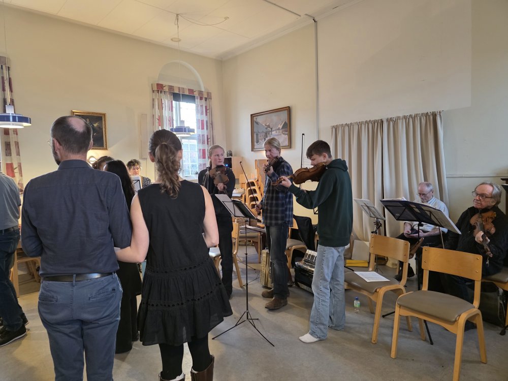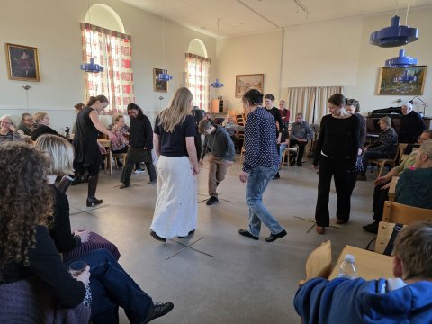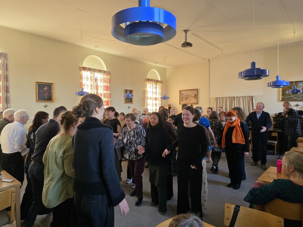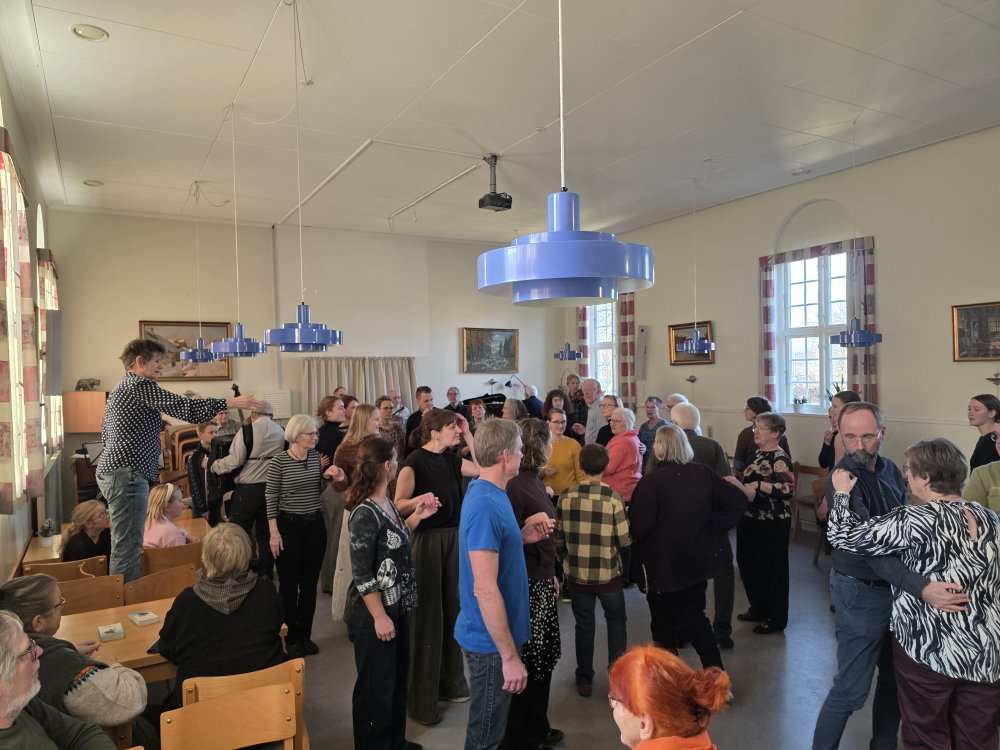 D. 18. januar i Aahuset, Aakirkeby, dansede folk løs. Lisbeth instruerede dansene og Niels Anker ledte Folk og Fæ medlemmer - yngre og ældre i forskellige grupperinger. Der manglede bestemt ikke dansere, nye samt rutinerede, i alle aldre.