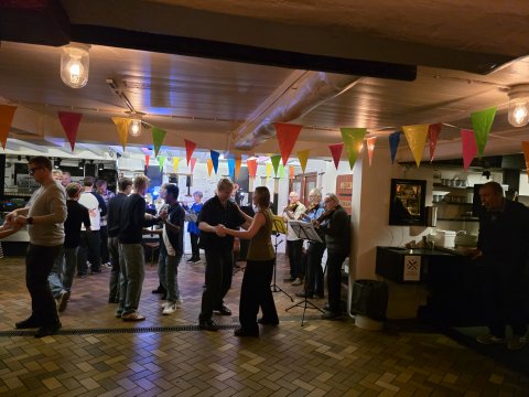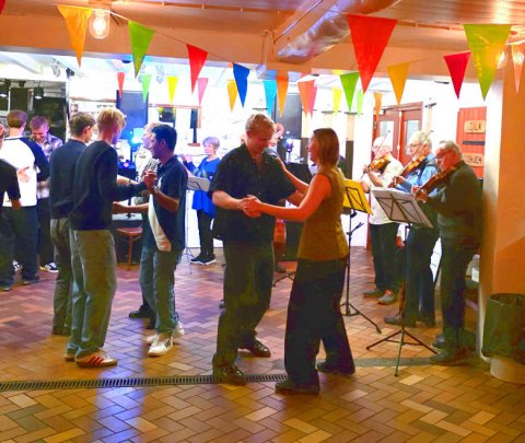 Det er efteråret på Bornholm, turistsæasonen er forbi og i Gudhjem er det slut for dette år med at holde åbent. I den anledning afholdt nogle forretninger en lukkefest i Gudhjems Røgeri. Som et indslag blev Folk og Fæ bedt om at spille og instruere til begynderdans. Det var stort set alle der var med til at danse og de fyldte godt i lokalet. De kunne knap nok være der. Men det var livligt og de så ud til at have det sjovt.